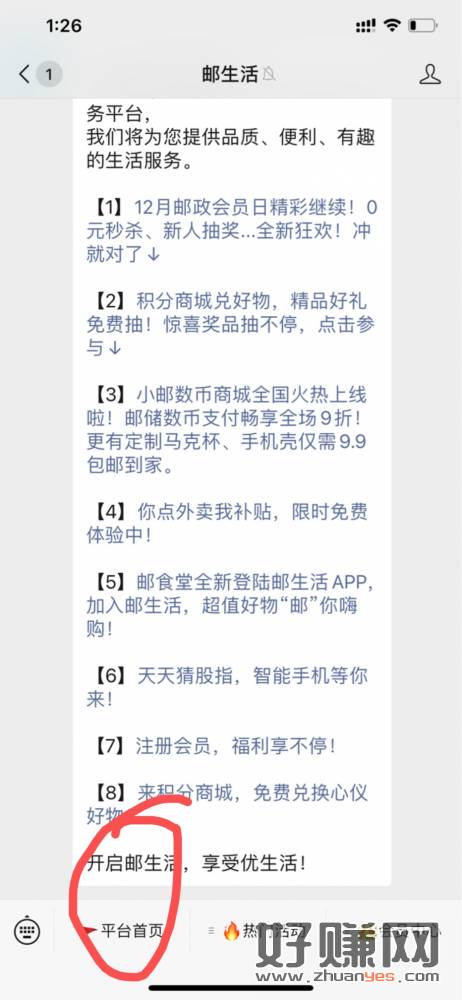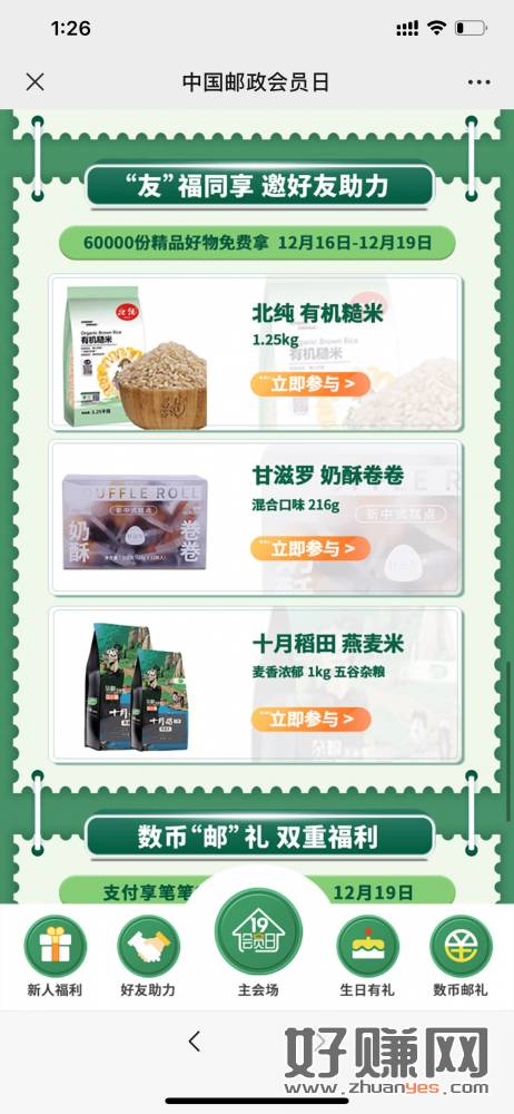 公众号邮生活,平台首页,横幅会员日,有0元秒杀和新人礼,还有简单拉5个人助力领大米