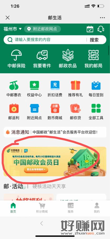 公众号邮生活,平台首页,横幅会员日,有0元秒杀和新人礼,还有