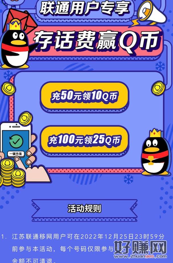【江苏联通】您有一个充值福利待参与!充50元最高领10个Q币,充100元最高领25个Q币!活动专用通道