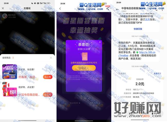 亲测2元电信话费秒到 电信星播客直播间抽奖即可