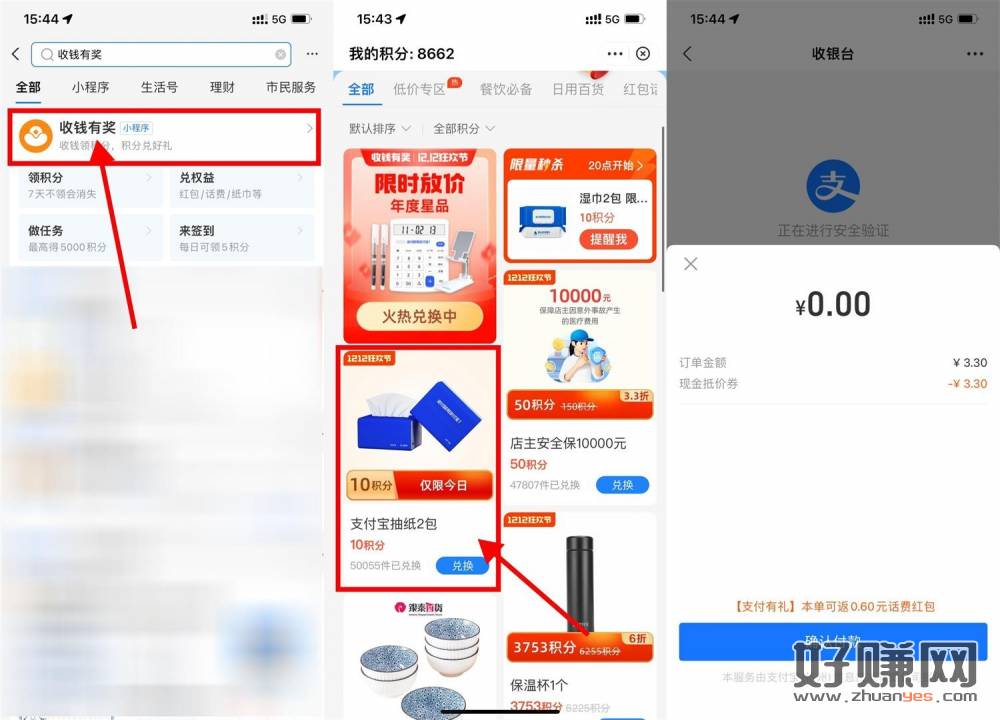 支付宝搜索“收钱有奖”->下拉找到“支付宝2包抽纸”->用10积分兑换0元下单即可!