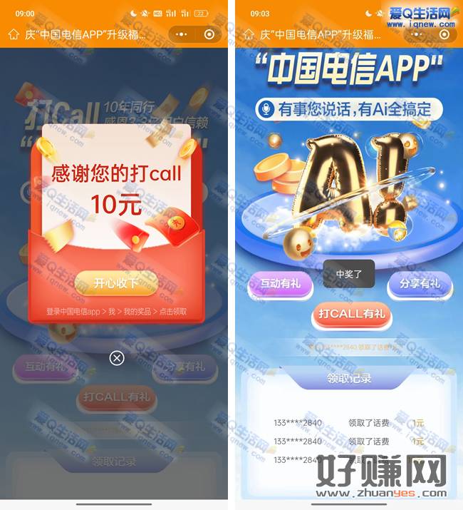 微信识别下方小程序 依次点击 打CALL有礼+互动有礼+分享有礼 都可以开到话费奖励