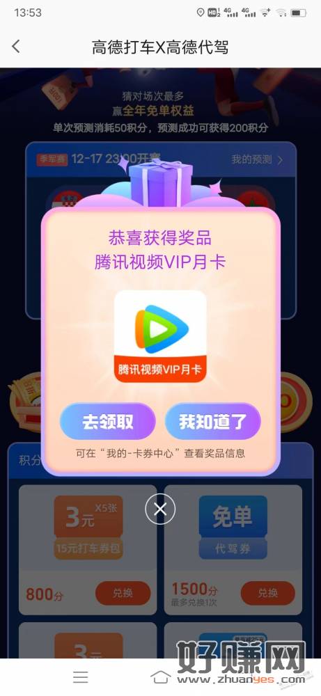 打开高德地图搜 预言世界杯, 得100积分,拉到中间抽奖,百分百中间,二中一 腾讯会员。