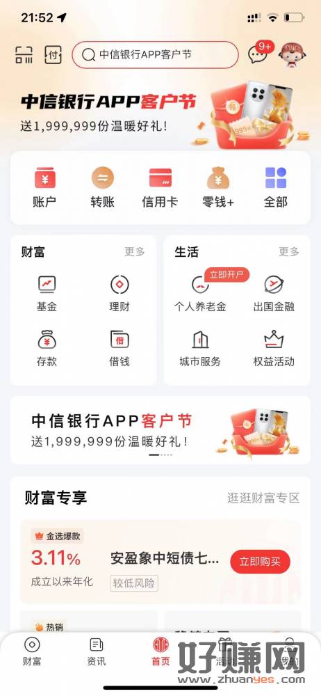 中信银行app首页最上面的客户节点进去,然后下拉点财富集卡,