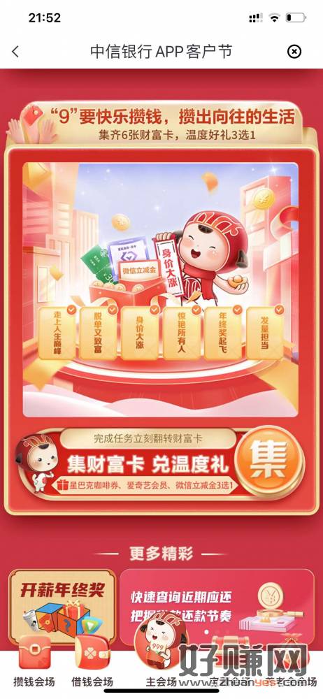 中信银行app首页最上面的客户节点进去,然后下拉点财富集卡,集齐六张可以兑换立减金,星巴克爱奇艺会员三选一