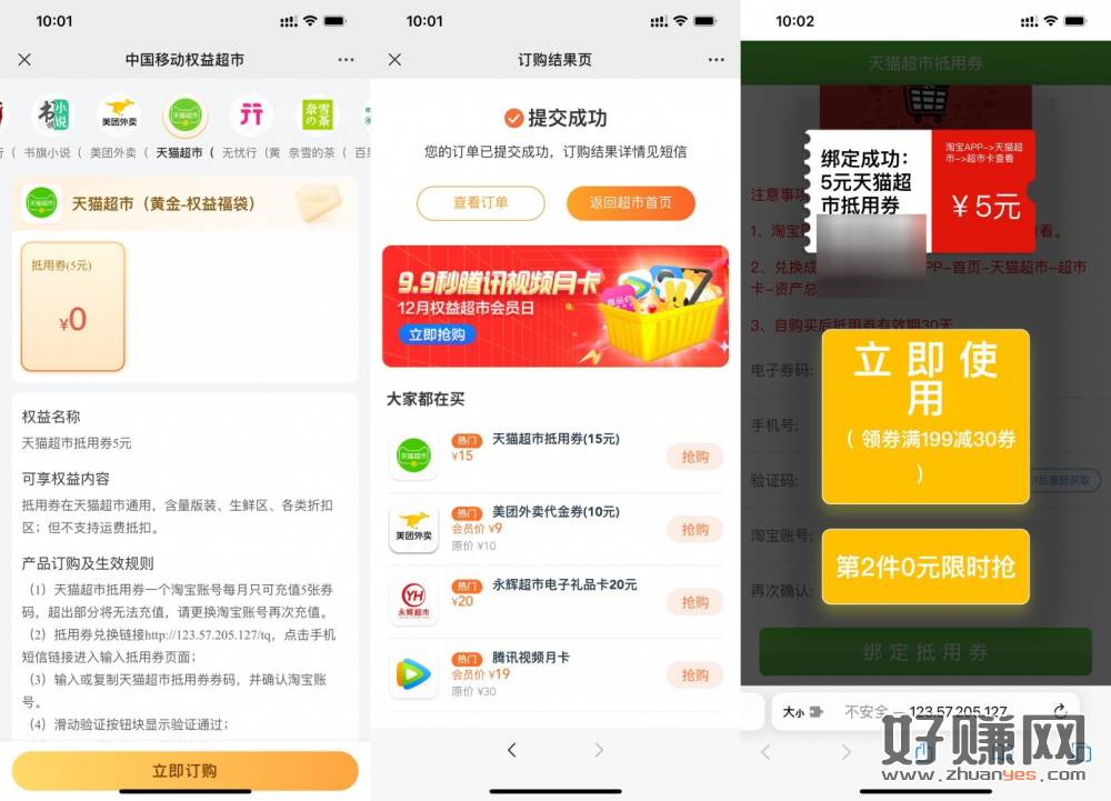 【移动权益会员领5元天猫超市卡】限移动黄金会员参与!打开地址登陆->直接领取->根据短信提示复制兑换码兑换即可