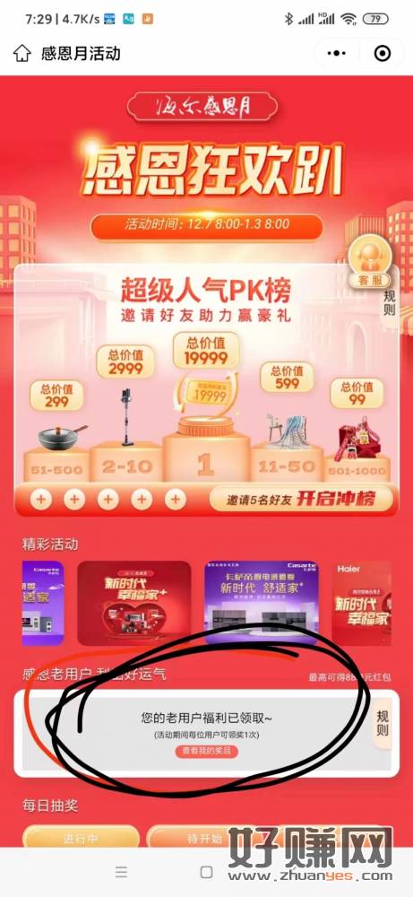 进去抽奖,左上角返回,图片那里,8点卡秒,很多8.8,18.8等,过了 1分钟就没水了,活动时间很长,一个号只能一次。