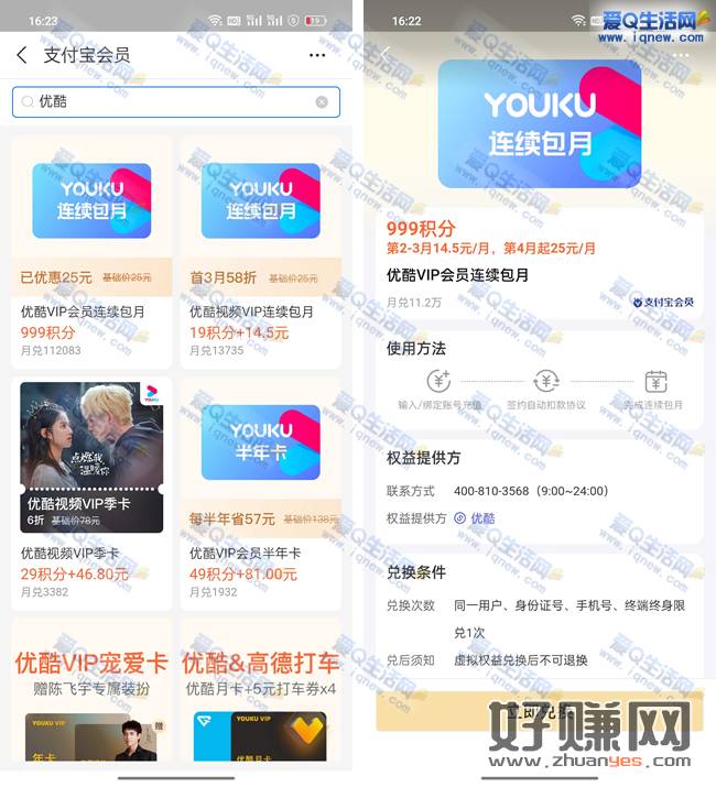 支付宝APP-支付宝会员-页面搜索【优酷】999积分兑换连续包月权益-兑换页面记得填写正确的号码哦