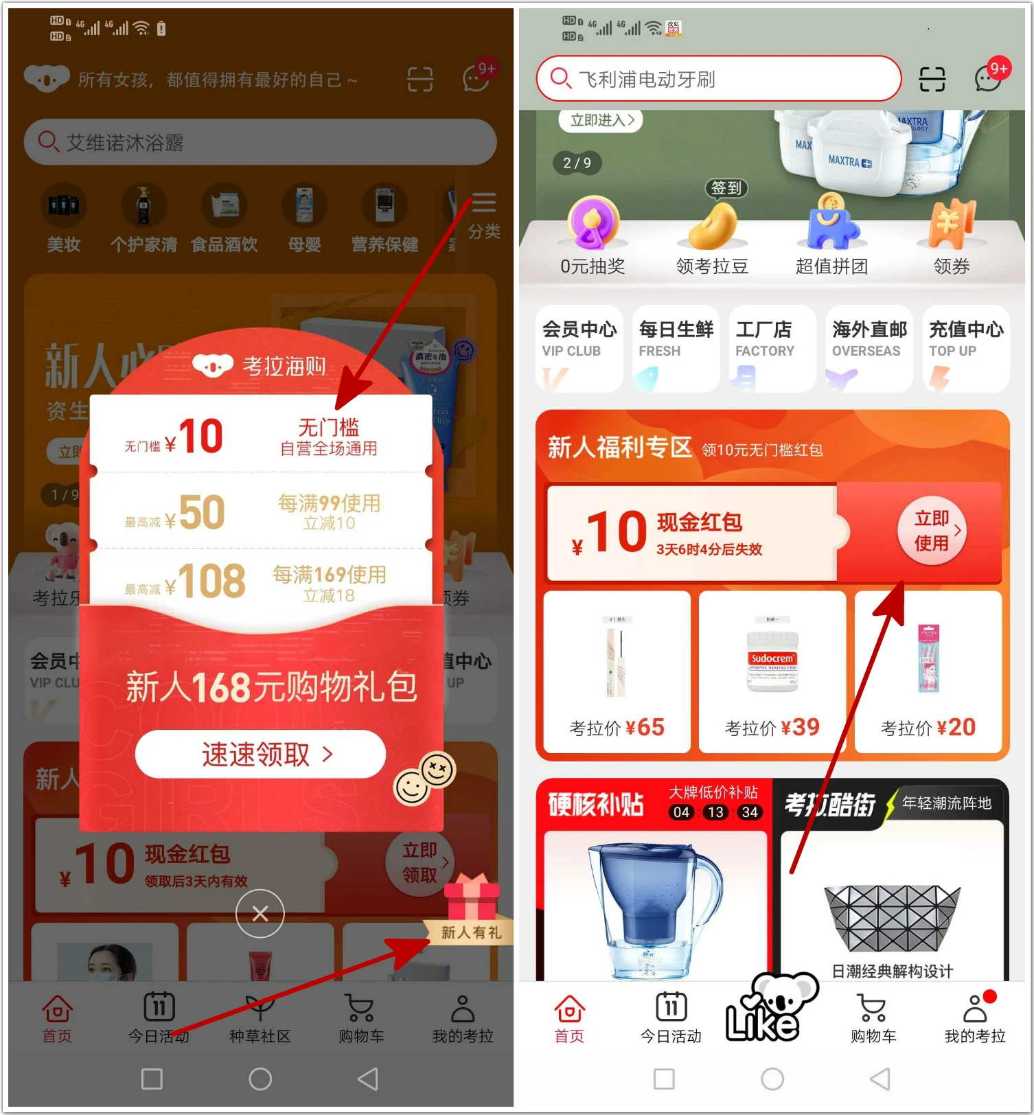 下载考拉海购app新用户注册领-10,下单不限制设备 接码无限撸实物