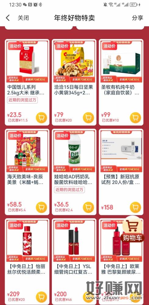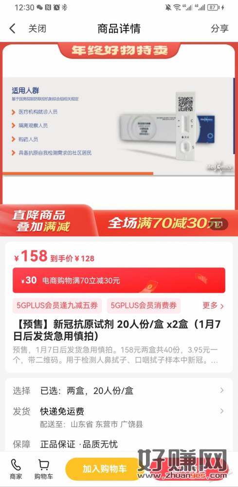 首页顶图70-30专区找,两盒40份原价158,减30直接128付款,还可以叠加之前的世界杯权益金,平均3元左右,1月发货