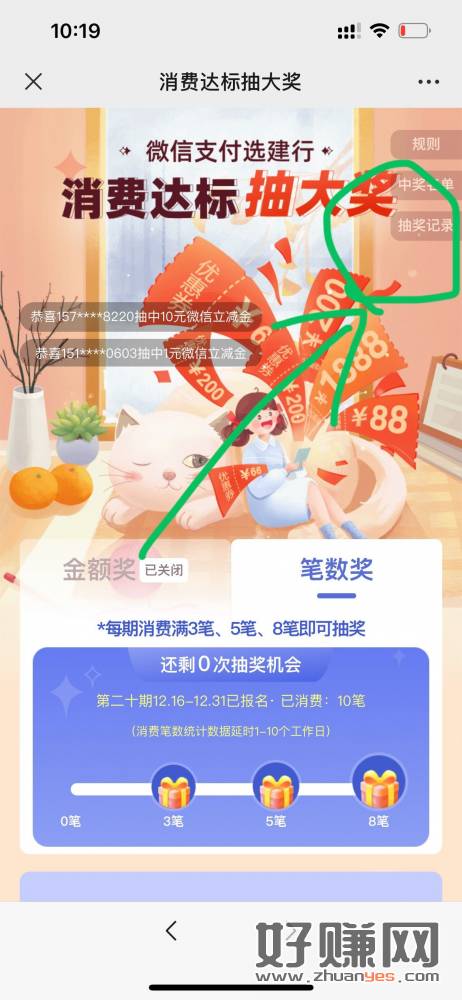 建行达标抽,右上角点抽奖记录,可以抽往期的,基本上都是立减金
