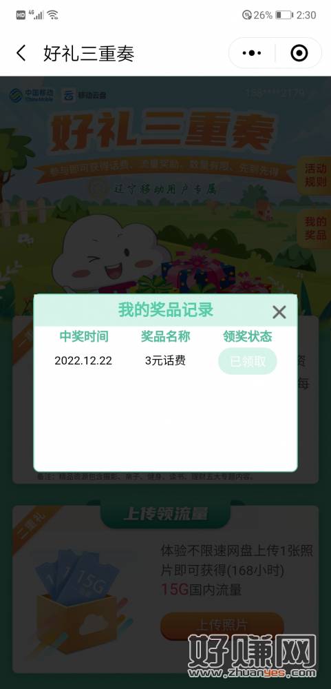 微信搜索< 中国移动左盘 >小程序,按提示领取3元话费,限中国移