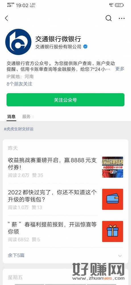 先去公众号绑定交通银行卡,然后用这个卡随便付一笔钱,点图进去兑换5立减