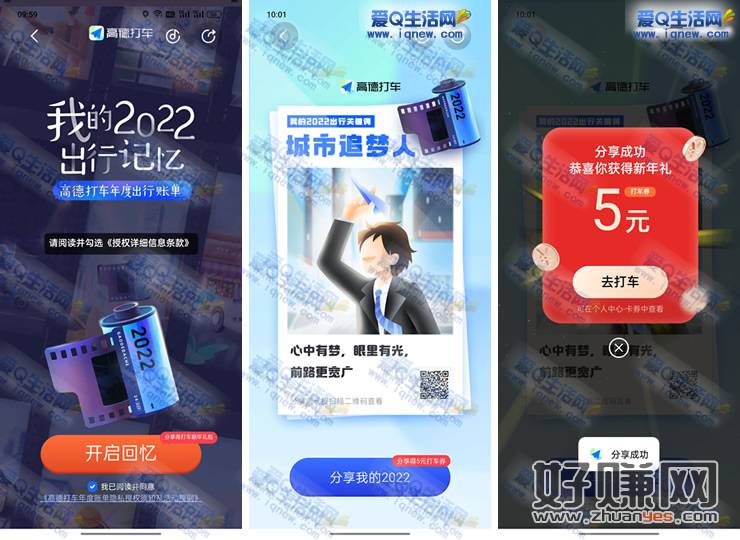 高德地图APP-打车-页面一直下拉找到【2022我的打车记忆】点进去-一直查看到最后分享一下可以获得5元打车直减券