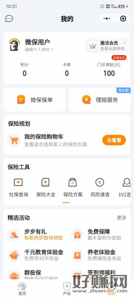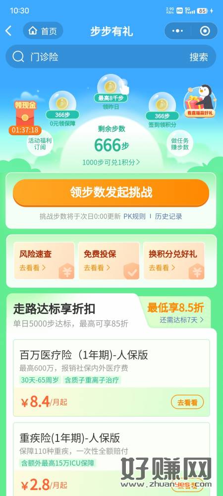 微信小程序:腾讯微保-我的-步步有礼-左上领现金,每24h可