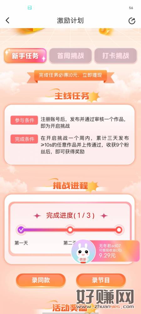 应用宝app搜索(sure)app下载登陆,新用户连续发3天作品,然后需要9个粉丝,完成以上两个要求新手奖励10元,提现秒到速度去亲测