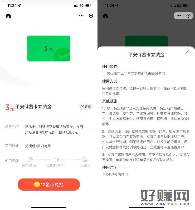 【微信12金币兑换3元平安立减金】打开地址->使用12金币兑换(金币不够就左上角小房子领取下),有平安卡的用户上吧#小程序://支付有优惠/J907eX1pdcpnnVg