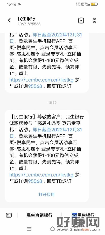 收到这个民生银行信息的去,最低3立减金。我运气有点背只抽了3。