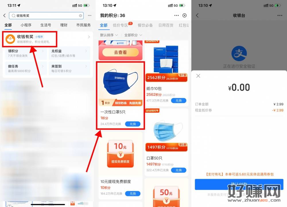 【支付宝0元撸一包5只口罩包邮】这一期只有部分人有!支付宝搜索“收钱有奖”->点小程序进入->下拉找到“一次性口罩5只 1积分”->用1积分兑换0元下单即可!