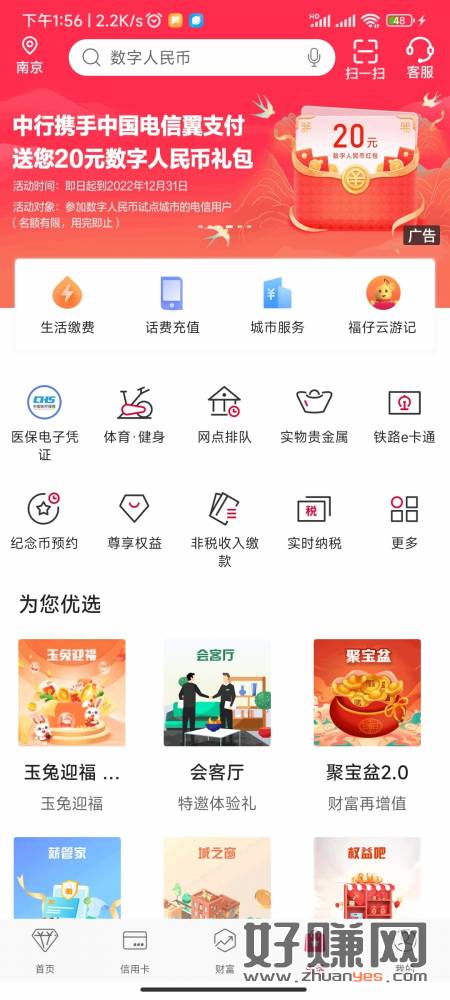 中国银行APP,领翼支付数字人民币,两张10块的,限电信,只