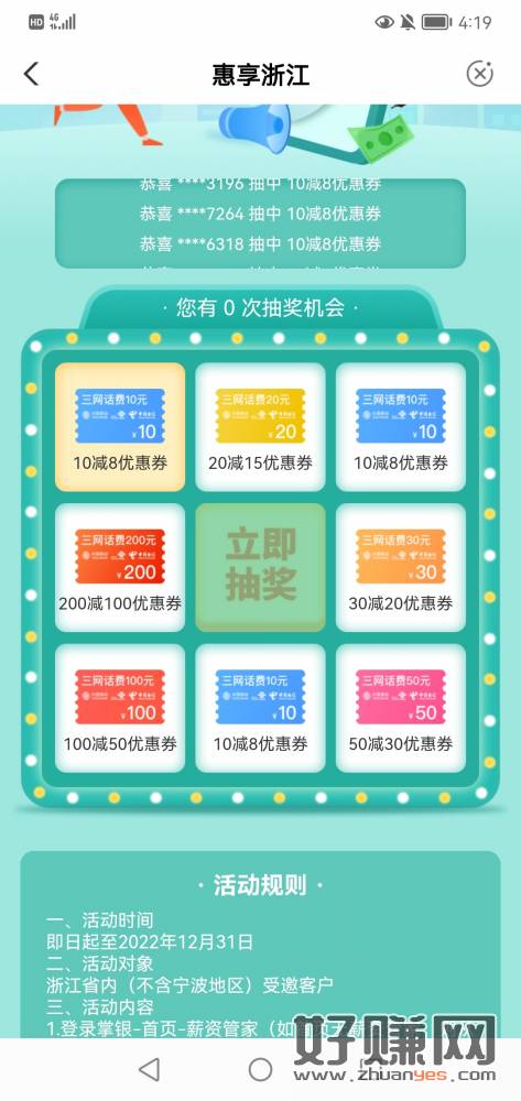 老农浙江话费,点链接直接跳转农行抽卷,最低十减八