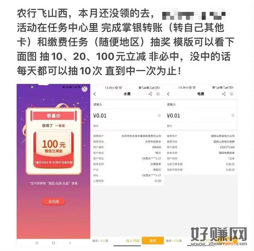 农行飞山西,任务中心缴费转账抽奖,10次机会抽。脸白大包