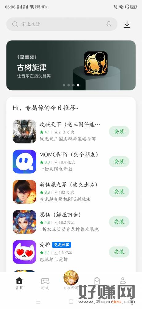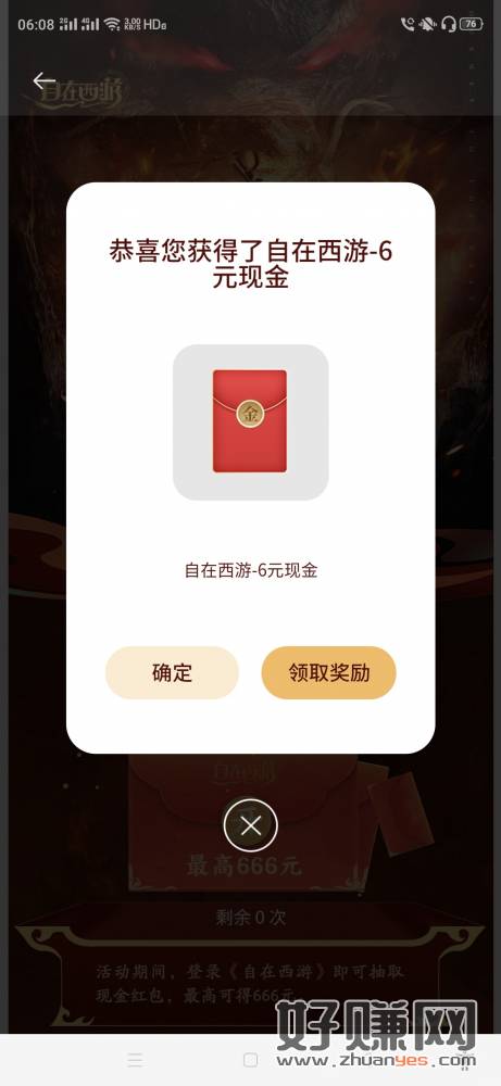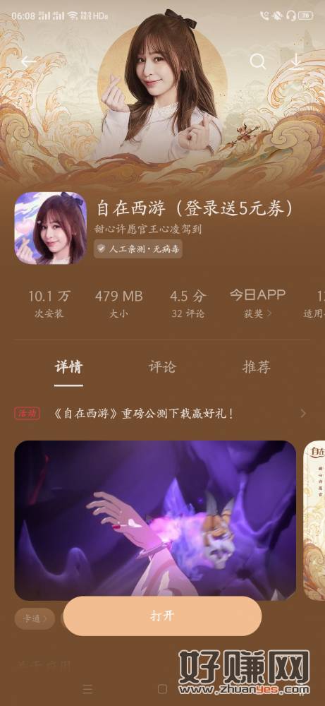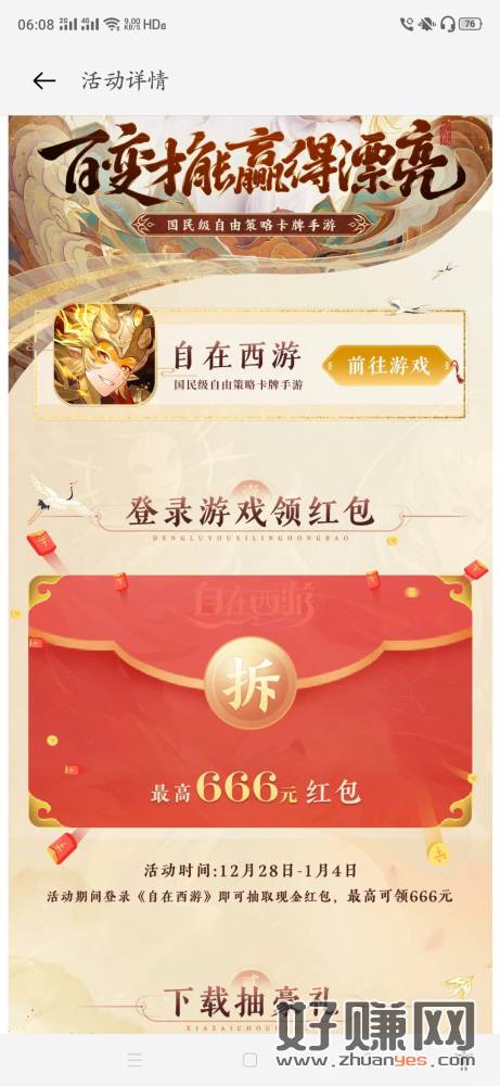 oppo手机自带软件商店,中间位置,或者直接搜索自在西游,详情活动进去,进去下载游戏,打开获取一次抽奖机会,刚中6元