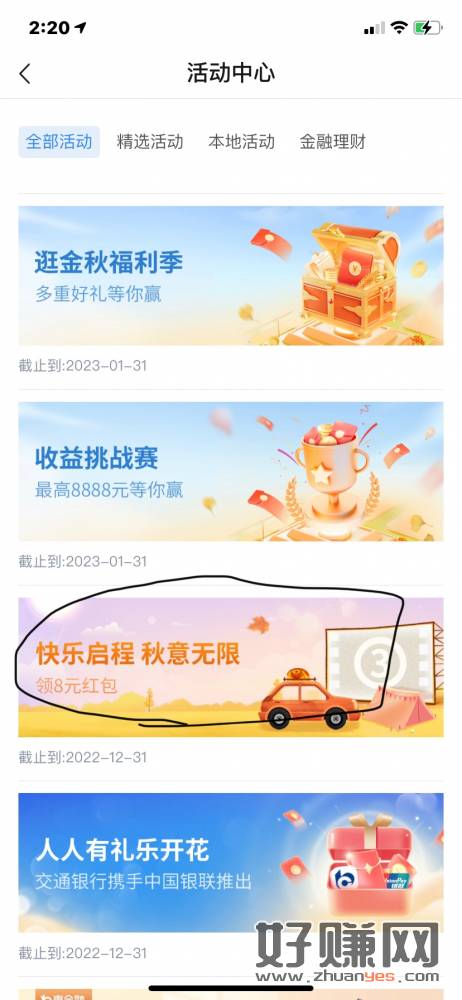 交通银行提醒贴。 热门活动-快乐启程- 领八支付。 视权益