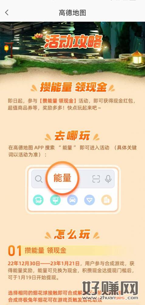高德地图举办的攒能量领现金瓜分亿元福利,通过打开高德地图APP进去活动里,每天完成指定的小任务可以活动而游戏次数,每次小游戏都会得到最少一两百能量,只要累积能量达到最少1000个就可以提现,每1000能量=1元现金,需要在1月19日10点之后提现到支付宝。