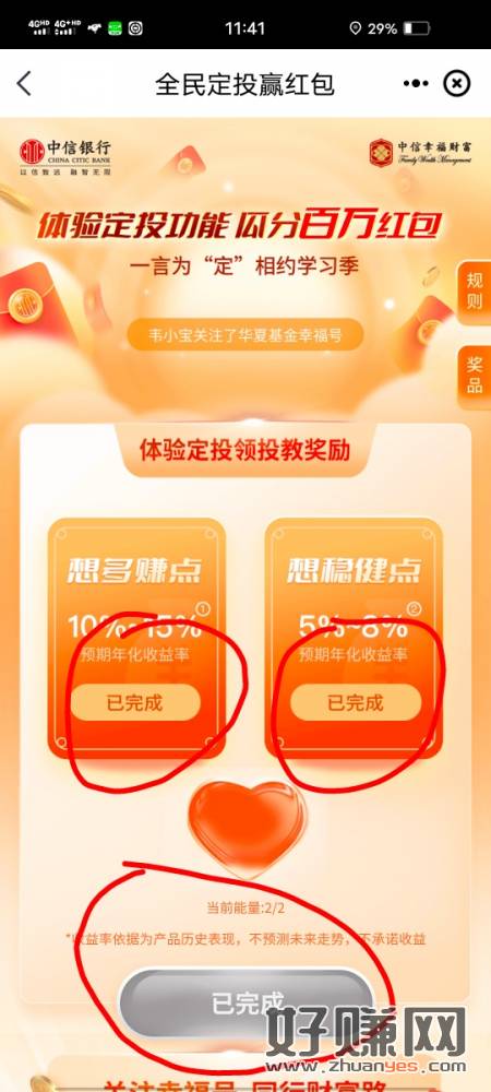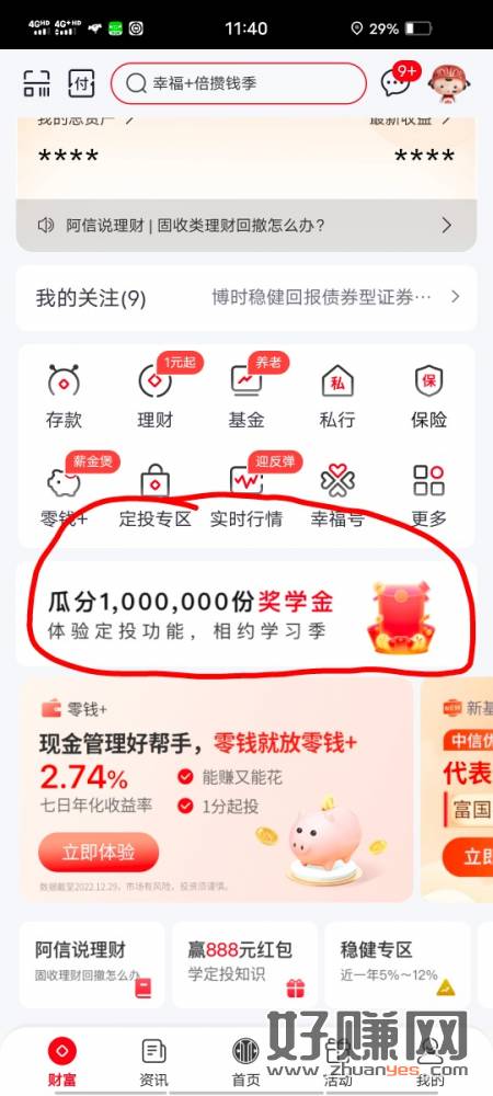 图①中信银行app登录 财富页面 中间活动滚动栏有个体验定投赢奖学金 点进去