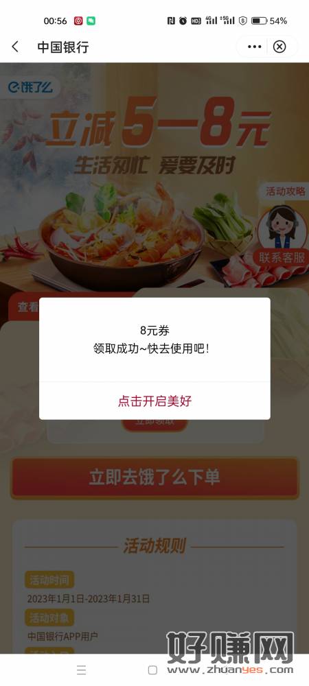 中国银行每月一次饿了么支付券5-8块目前两号都是8,常点外卖的去试试