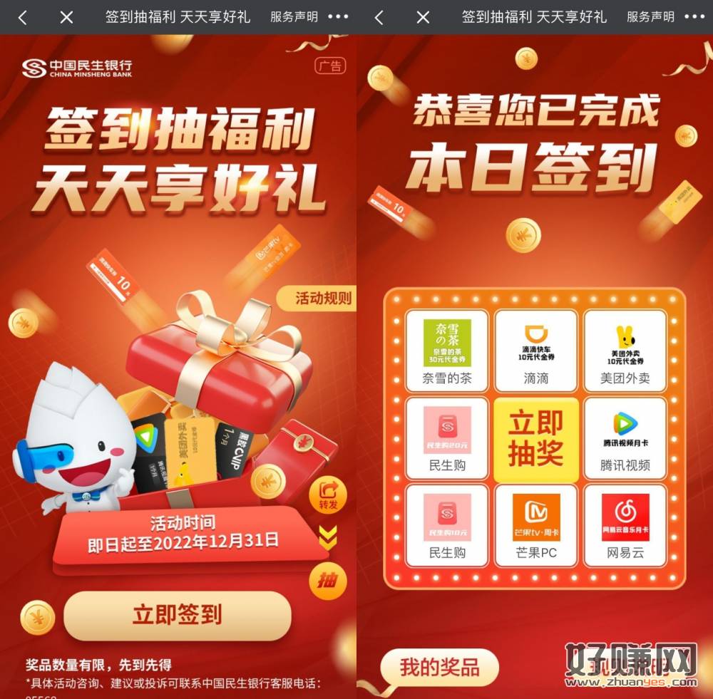 民生yin行APP搜索“签到”->签到得次数->抽中视频会员、美团、奈雪、滴滴券才有用,截止到3月31日结束