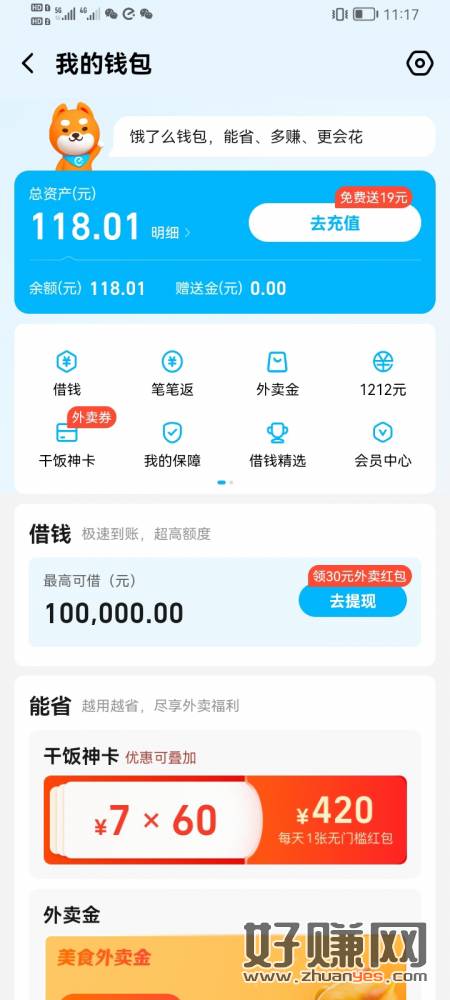饿了么APP-我的钱包-笔笔返 开浦发三类卡充值100可马上提现然后会给18块现金也可提现,做完等会有延迟