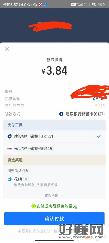 支付宝搜索“靡潮卡牌”和“魔核”->领取2张满5亓立减消费券->进入自己小号的微博主页->左下角“赞赏”进入->使用支付宝自动抵扣券 然后小号去提现即可
