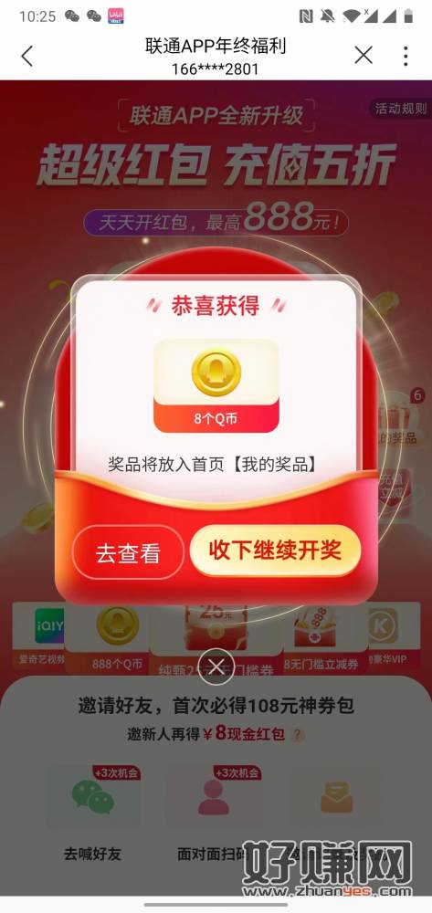 联通App升级礼包那个,抽3币不是必中的刚中8Q币