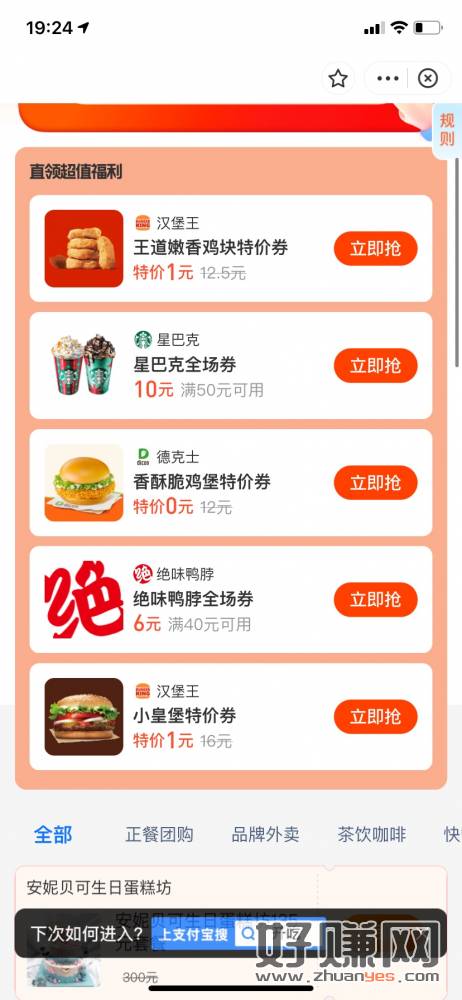 支付宝搜开吃 1元汉堡王+0元德克士