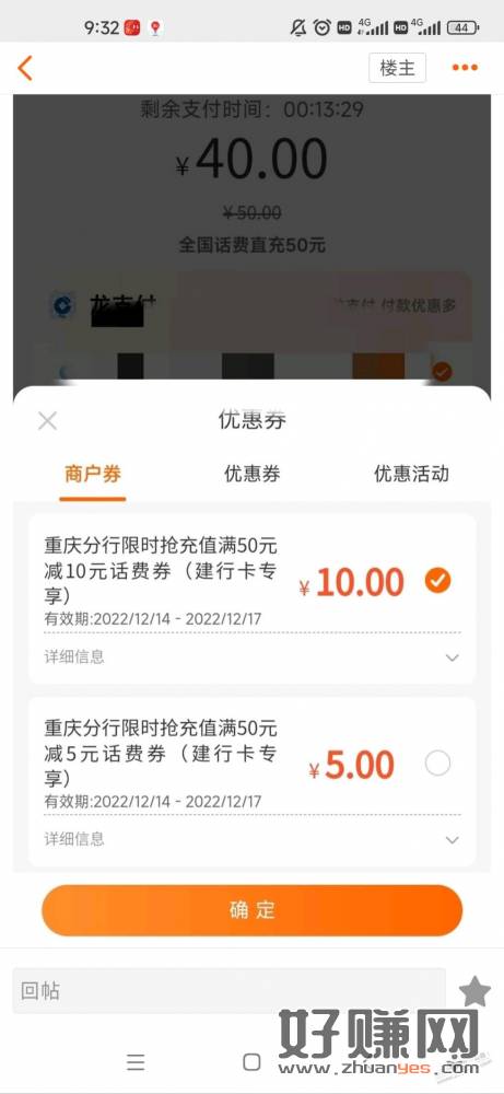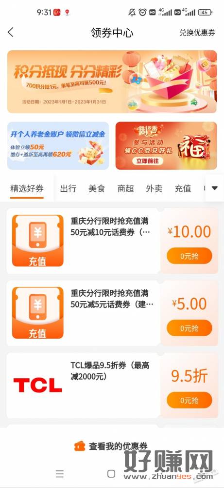 建行生活首页,选择重庆,领卷中心,50-10,50-5话费卷!8折.9折话费可以给别人冲! 只能领一次,上个月领了的不行!