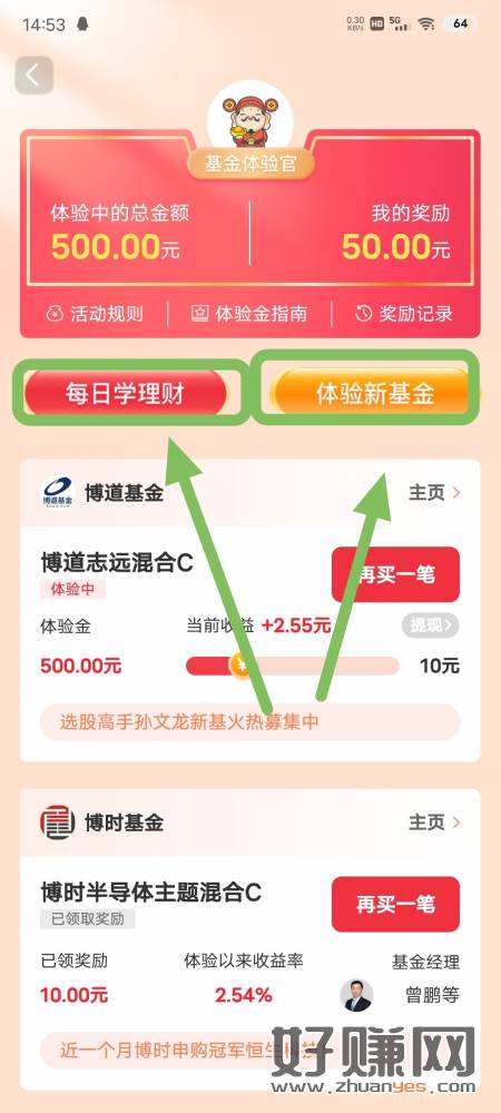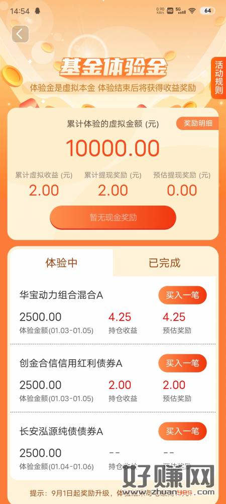 天天基金APP,不用开户但是要绑卡,搜索体验基金,还有体验金,两个任务都做,时间要好几天,利润70以上吧