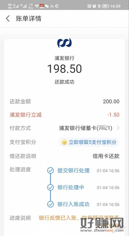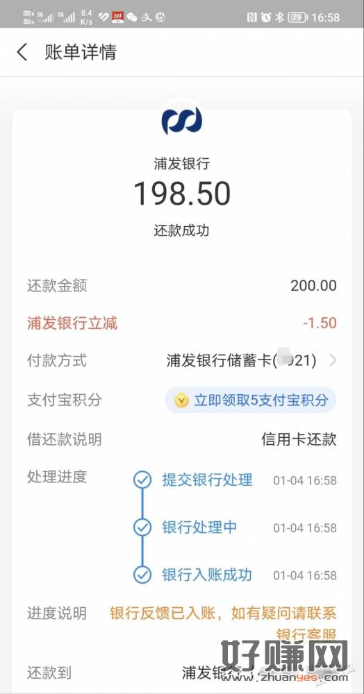 支付宝xyk还款,用浦发借记卡还款满200减1.5元,可以还两次。