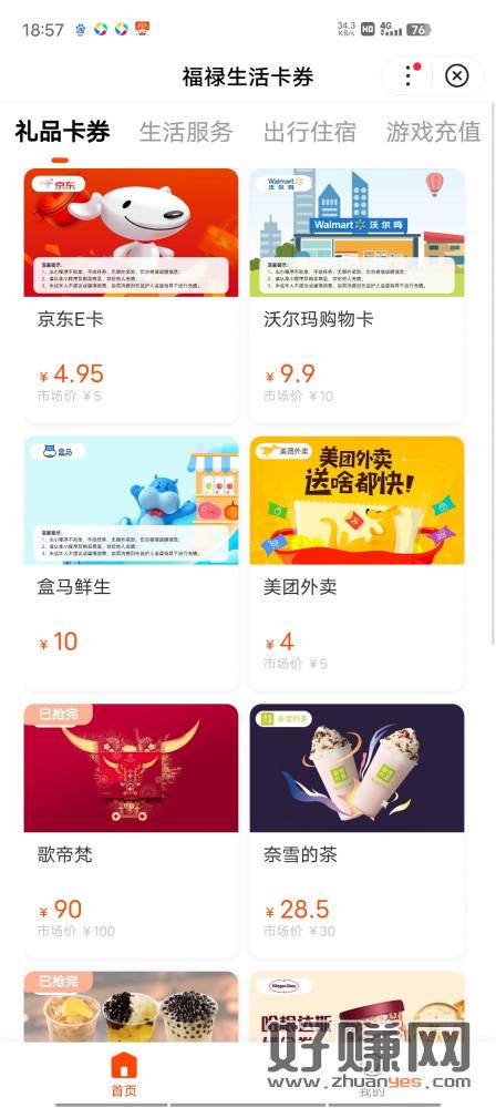 支付宝搜阿果达和鼎信充值领两张5元立减券,然后去百度app搜索福禄生活卡券小程序,进去买两张10元的e卡,闲卡宝秒出