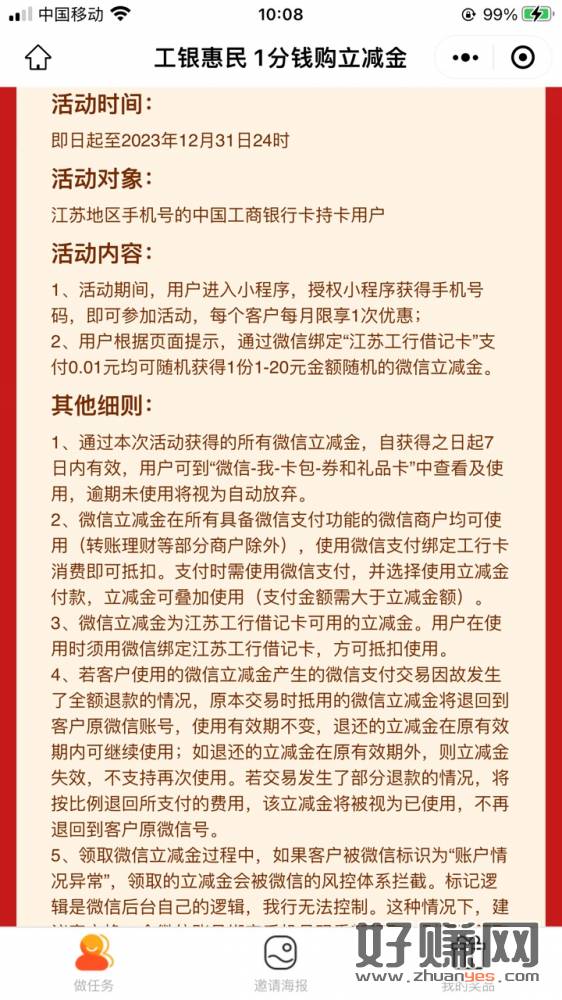 首发江苏工行1分领立减金1-20随机,是江苏工行卡就行人人有份,微信扫码,我领了个5块,有领到十几20的来反馈。