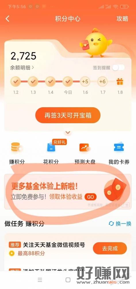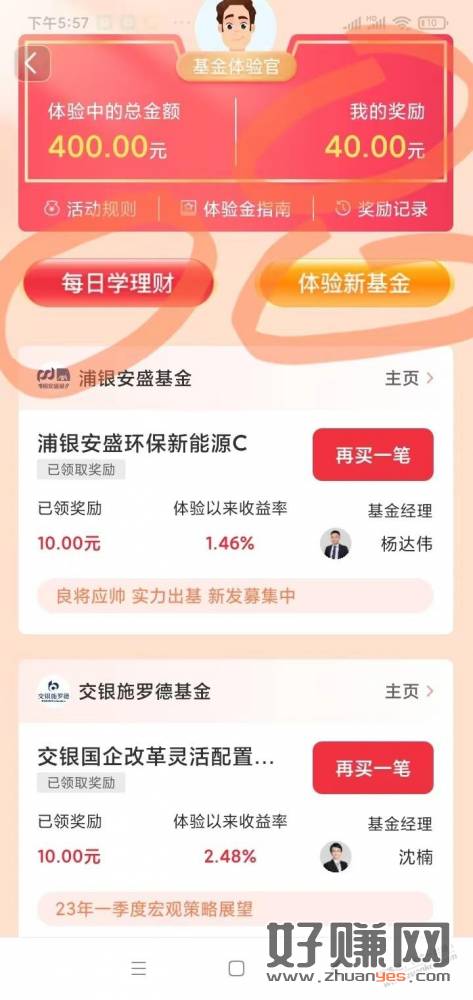 app,我的 积分,积分中心 进去,更多基金上新啦 点进去,点每日学理财 积累理财芝士分,体验新基金,100份理财芝士可兑换一份新体验金,当100份产生收益2元或以上时,可把体验金手动从100 调到500,收益立马变到10元提现,5个工作日内以货币基金发放。如我如下这个已领到40元了。