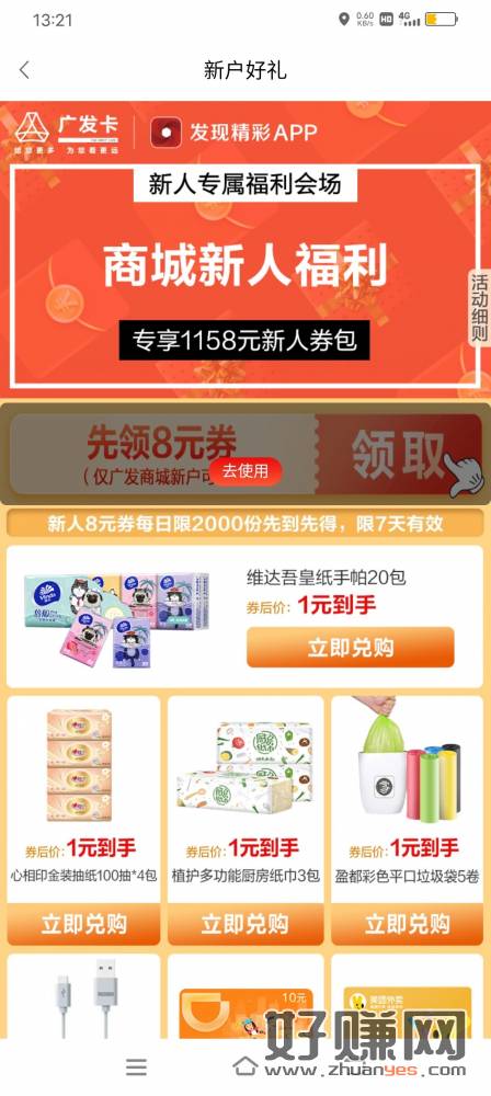 限广发银行广发商城新用户领8元券通用券可以卖实物1元卖美团滴