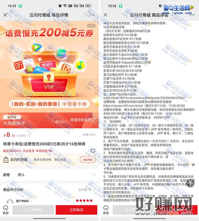 2.云闪付APP-我的-奖励-票券-腾讯视频5.7折-点击使用 记得填写好充值账号 腾讯视频不秒到
