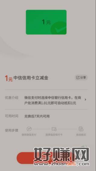 中信xing/用卡4金币换一块微信立减金