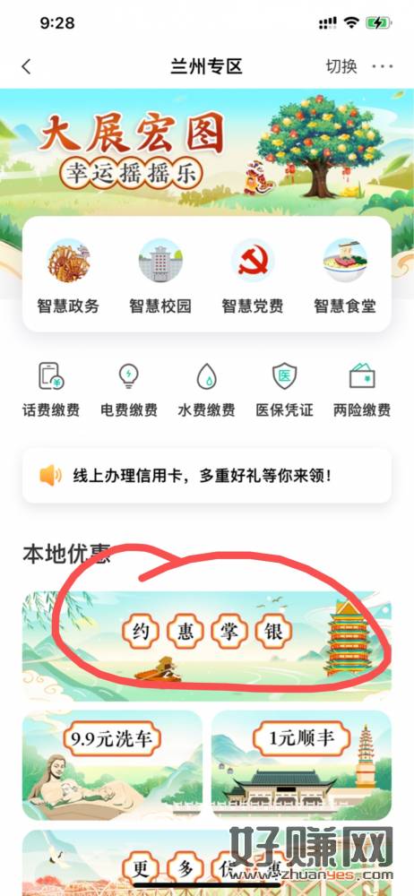 农行飞甘肃一城市专区改兰州—约惠掌银—约惠星期六—1块钱买10e卡或者20肯德基代金券,活动十点开始