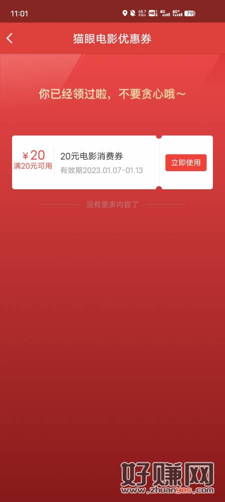 猫眼app,四川的用户去抢,横幅第一个,满20减20,现在还有