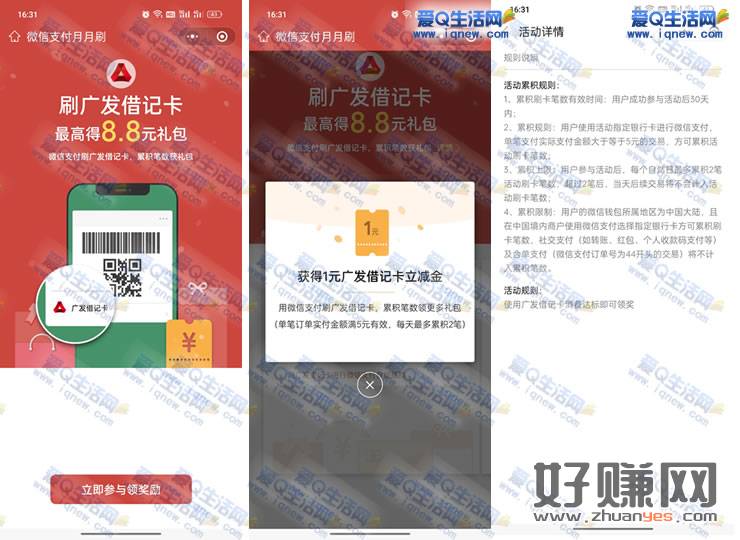 1.微信识别下方活动地址-广发银行借记卡用户报名领取【参与有礼奖励】微信立减金-达到相应的支付笔数 开启新的立减金奖励