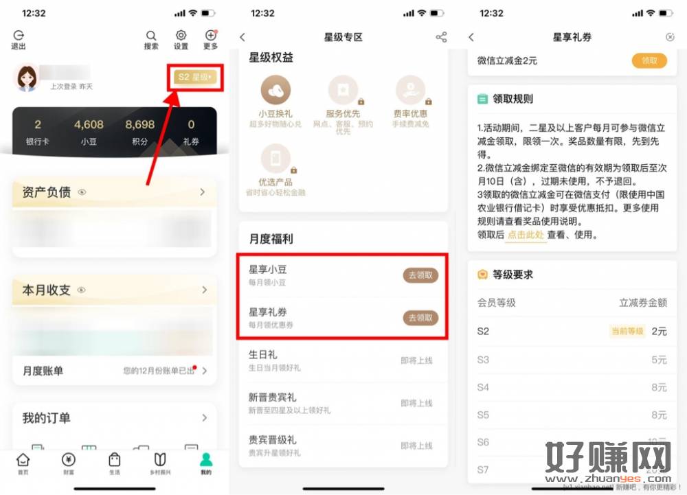 [ 农行APP->底部“我的”->星级图标->最少要两星(一星