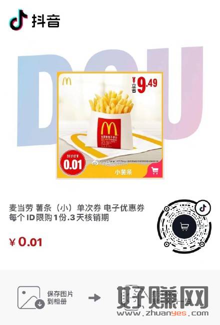 【抖音0.01元撸麦当劳小份薯条】抖音APP扫码->直接购买->有效期3天,需到店任意随单消费可用